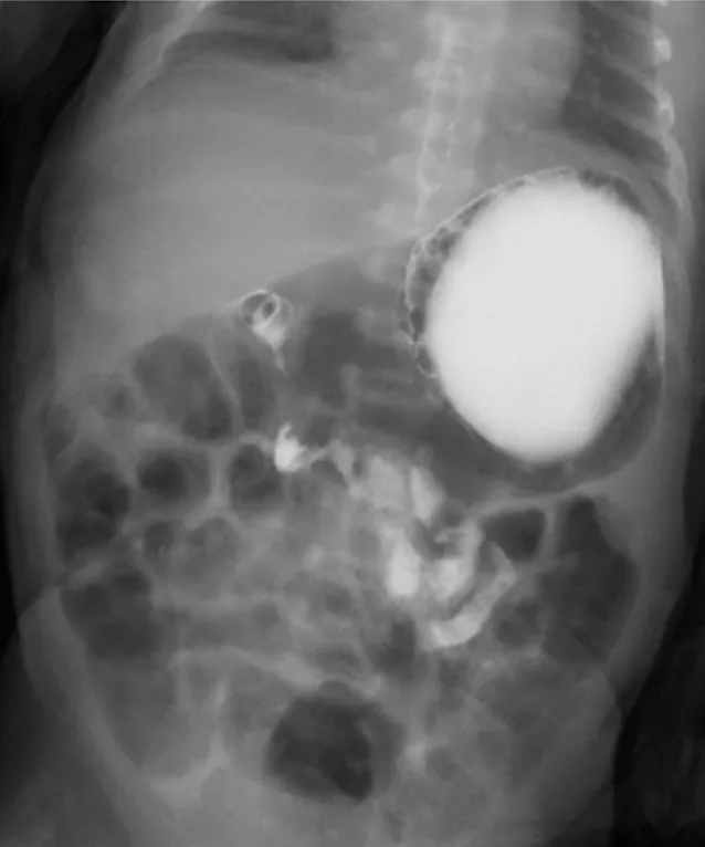 【115-1 醫學(四) 第74題】出生兩天大的女嬰因嘔吐不止就醫,接受上消化道攝影結果如圖示,下列何者為最可能之診斷?