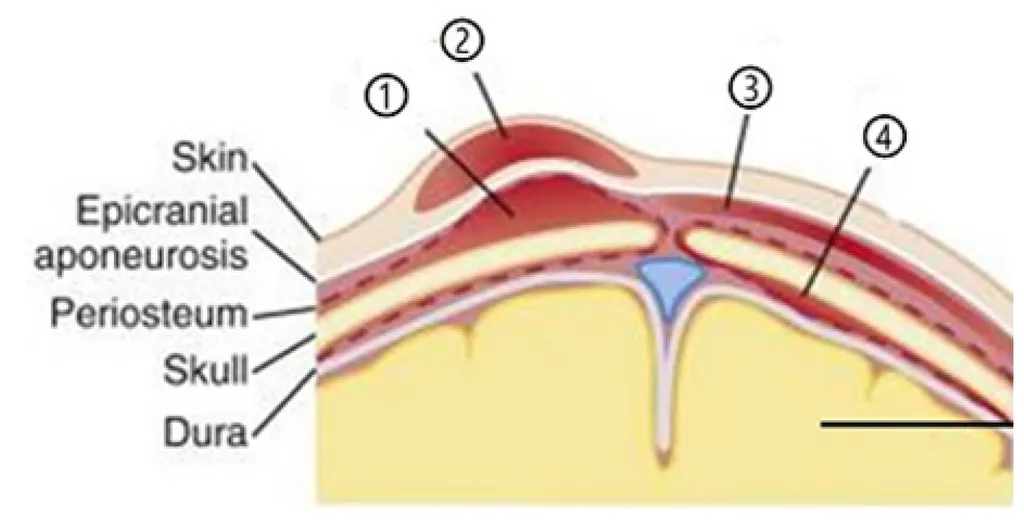 【115-1 醫學(四) 第3題】足月新生兒因分娩延長,婦產科醫師以真空吸引協助娩出。出生後兩小時頭圍增加 1 公分,膚色蒼白,心跳每分鐘 190 次,血壓 42/20 mmHg。附圖為頭部剖面圖,最可能造成大量出血的位置為圖中何處?